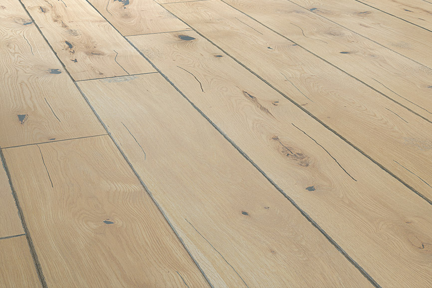 I love the atmosphere in old cellars where fine wines mature. The puffs of dust rising into the air. The pinhole traces of woodworm on wooden beams. Practically invisible in the lazy twilight reigning all around, detectable only to the fingers. And the silence... That is where excellence matures best. A heavily aged wood floor in a rustic style. Its finesse is in the natural qualities of the wood, brought out by deliberate ageing of the floorboards through manual planing, brushing and bevelling. The distinctive effect is intensified by deliberate scratching and denting of the surface, and fine holes imitating woodworm. Surface with extra protection by natural oil.